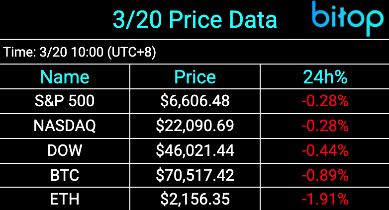 Following a media address by Israeli Prime Minister Benjamin Netanyahu, oil prices retreated, and U.S. stocks regained some lost ground. However, the crypto market weakened again. Bitcoin ETF inflows snapped a seven-day streak, with BTC briefly dipping below 69,000 yesterday. Consequently, the Fear & Greed Index fell back into the "Fear" zone at 31.