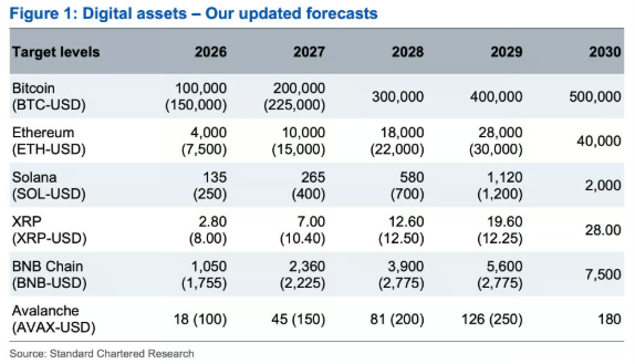 Standard Chartered also lowered its year-end target prices for various crypto assets, adjusting Bitcoin from $150,000 to $100,000, and Ethereum from $7,500 to $4,000.